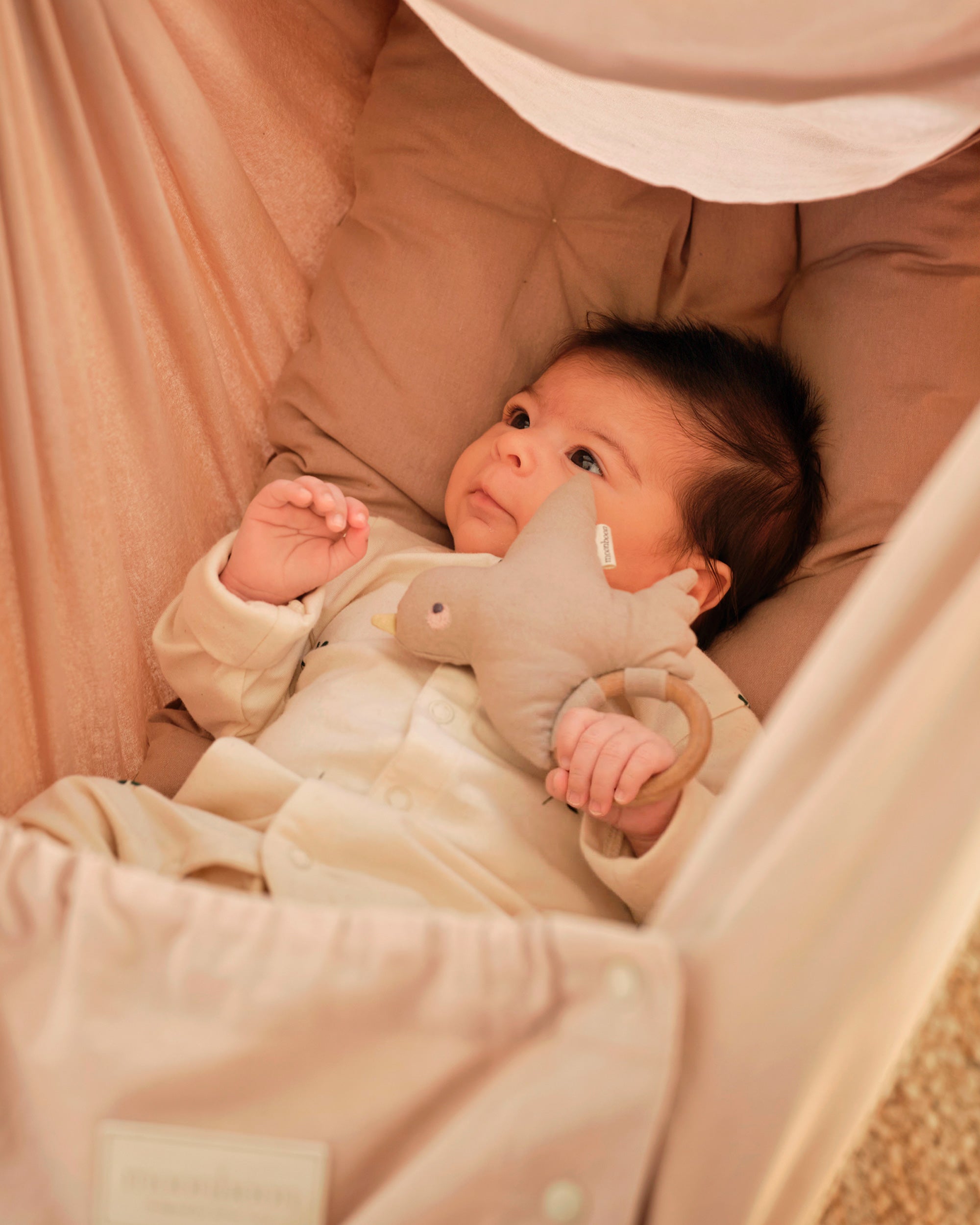The charming rattle features our soft bird perched on a wooden ring, perfectly crafted to fit little hands. It gently captivates and encourages sensory development during moments of wonder.